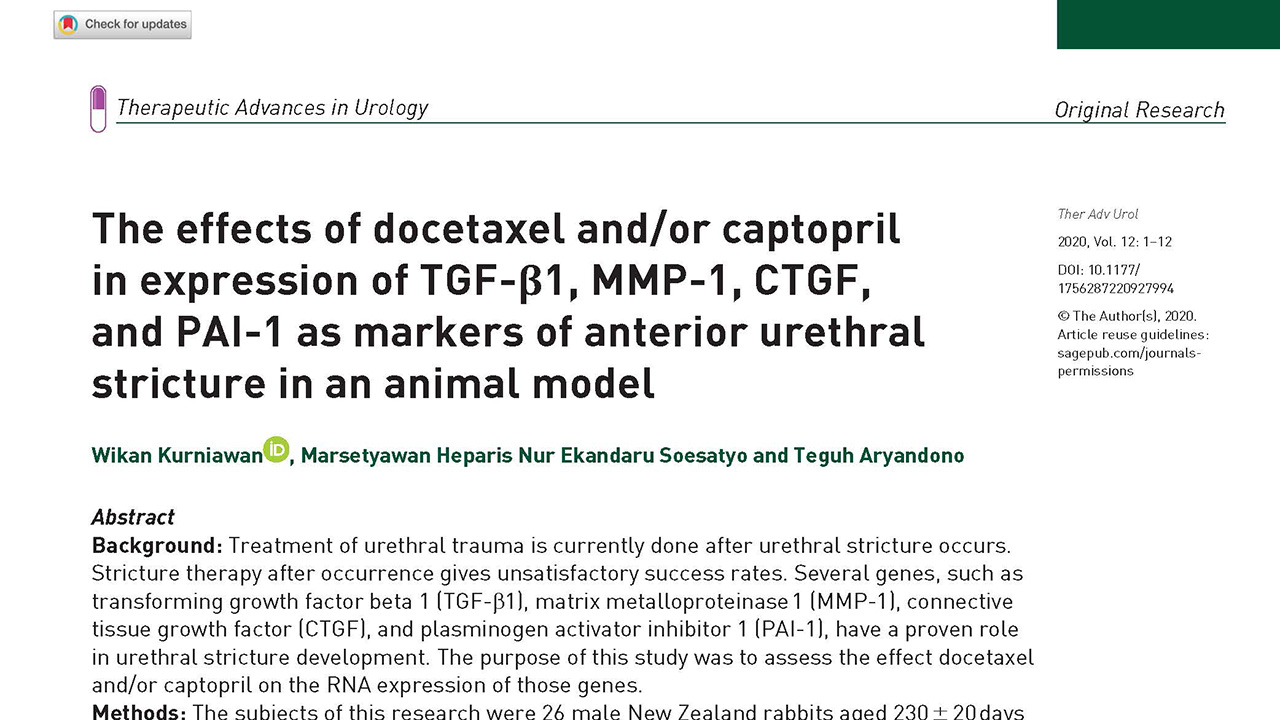 Publikasi The effects of docetaxel and/or captopril in expression of TGF-β1, MMP-1, CTGF, and PAI-1 as markers of anterior urethral stricture in an animal model Administrator August 11, 2021