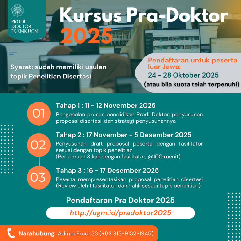 Prodi S3 Ilmu Kedokteran-Kesehatan FKKMK UGM kembali menyelenggarakan Program Pra-Doktor bagi peserta dari UGM dan luar UGM.