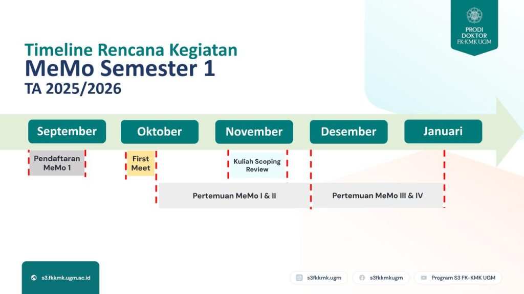 Program Mentoring Monitoring (MeMo) semester 1 adalah program mentoring bagi mahasiswa semester pertama Prodi Doktor Ilmu Kedokteran dan Kesehatan FK-KMK UGM.